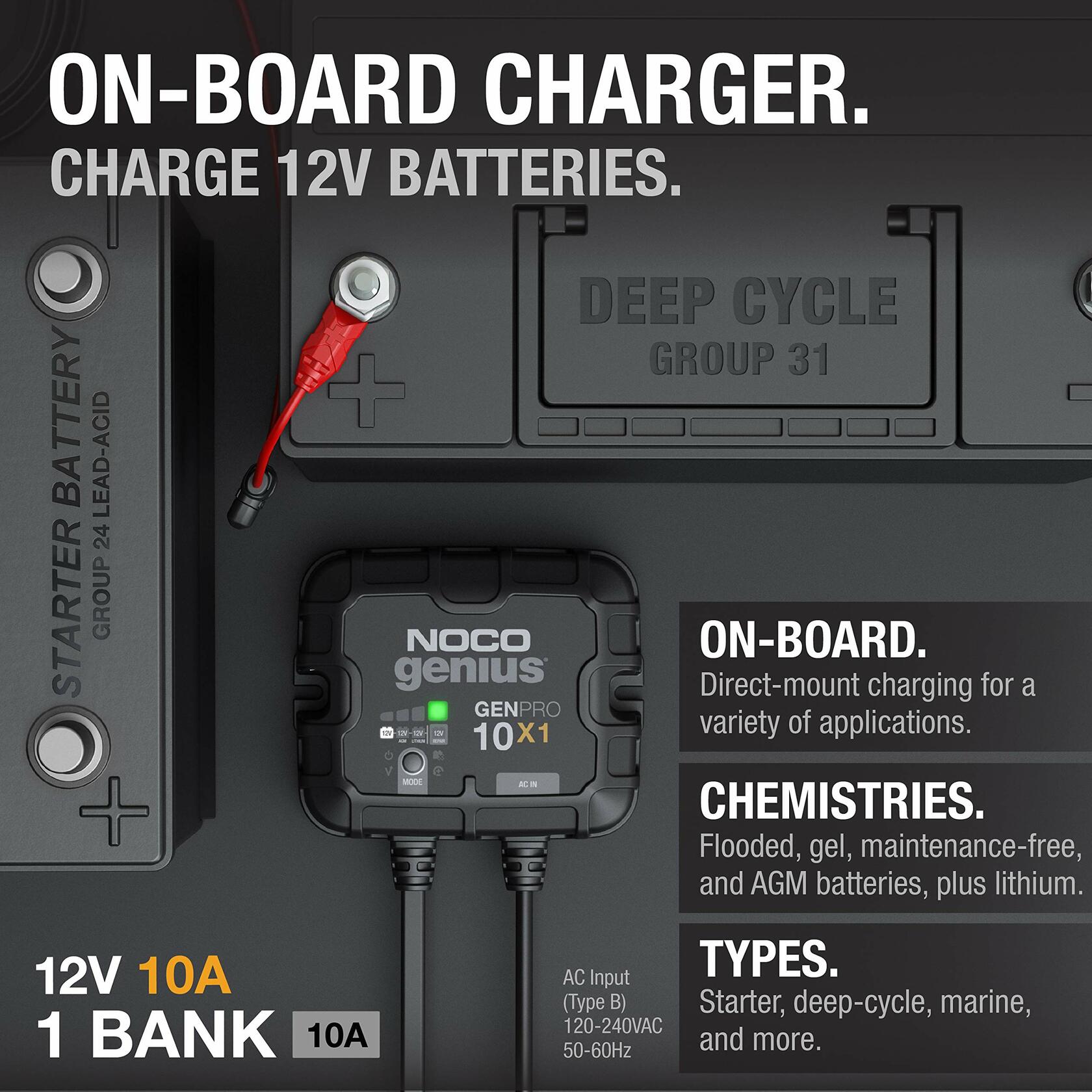 - SINGLE BANK — A one-bank onboard battery charger rated at 10 amps total - 10 amps per bank. Independently charge 12V batteries in marine, boat, starter, and deep-cycle systems.
